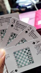The front of each card usually shows the starting moves of the opening and a diagram of the initial position. The back of the card typically includes details such as the name of the opening, the key variations and moves associated with the opening, common strategies and tactics for each side, and other relevant information.